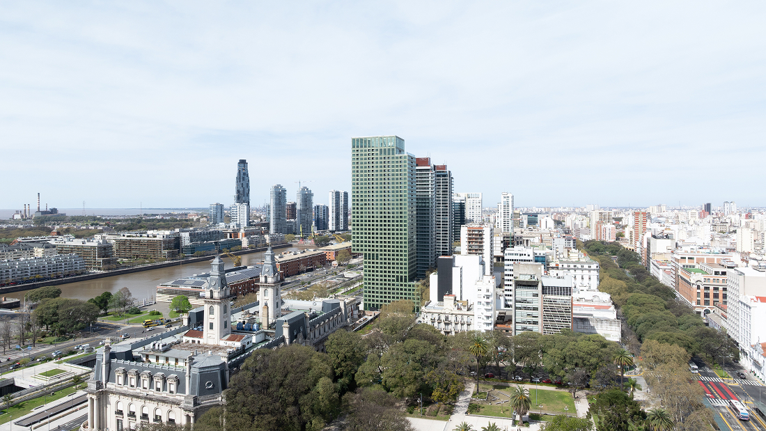 En el borde que articula el casco histórico con la expansión contemporánea de Buenos Aires, Adamo-Faiden proyecta una torre de viviendas que incorpora una plaza pública en planta baja, reconfigurando la relación entre edificio y ciudad.