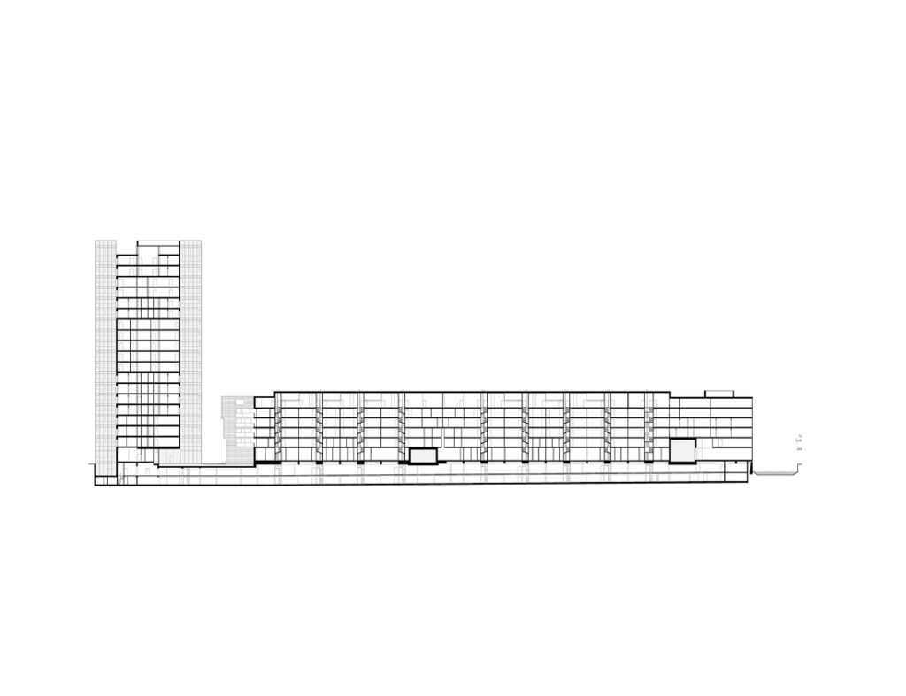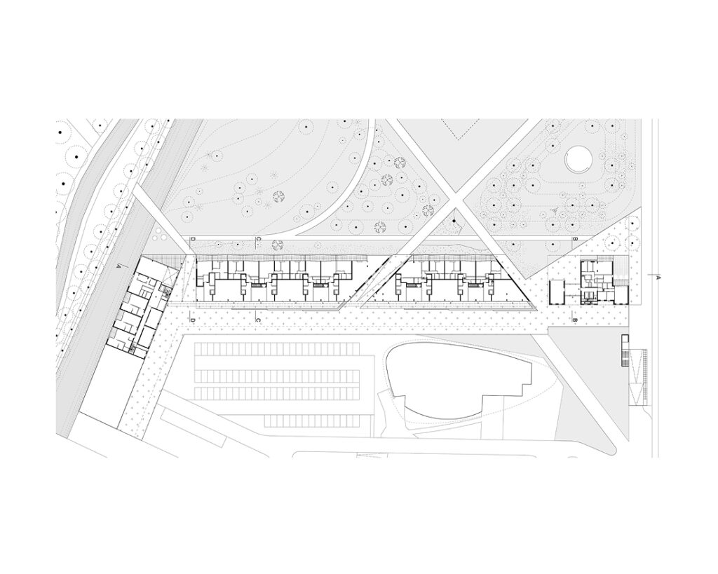 En contraste, la barra se extiende a lo largo de ciento cuarenta metros y alcanza seis niveles de altura, con diecinueve mil metros cuadrados que combinan vivienda y programa comercial. Concebida como un cuerpo horizontal en contacto directo con el jardín, su volumetría se fragmenta en cada nivel, generando terrazas y retranqueos que descomponen la escala.