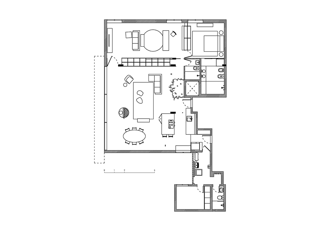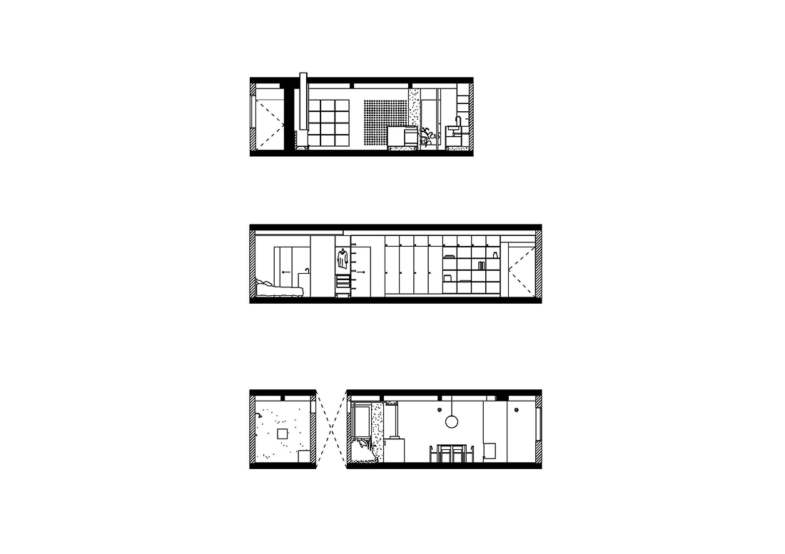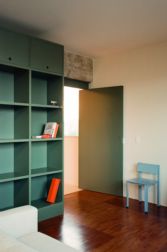 El proyecto de Apartment I toma esta división original como punto de partida. Se demolieron todos los muros interiores de mampostería y las áreas se redefinieron mediante placares. Dos líneas estructuran y organizan la planta: son perpendiculares entre sí y se cruzan en la transición entre el estar y el escritorio.