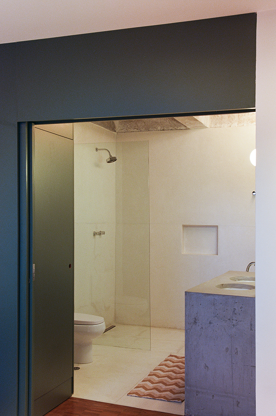 El módulo del dormitorio integra el escritorio y el dormitorio principal con baño en suite, acompañados longitudinalmente por el placar que los separa del estar. Entre el escritorio y el dormitorio se dispone un placar accesible desde ambos lados, que eventualmente podría replicarse para generar un dormitorio adicional en la mitad superior del escritorio, donde existe un segundo acceso.