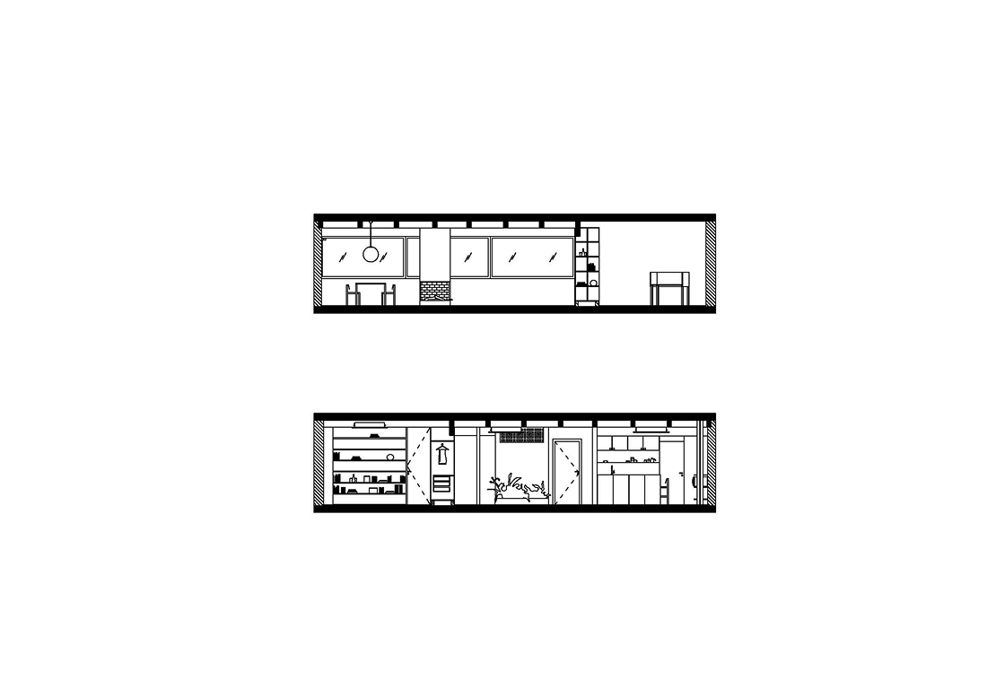La primera línea integra la mesada de cocina, la puerta de acceso, una jardinera, el conducto de ventilación del edificio, el baño de visitas y el placar que separa el dormitorio del escritorio. La segunda línea corresponde al placar que divide el estar del escritorio, recorriendo todo el ancho del departamento y separando también el dormitorio del baño.