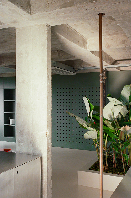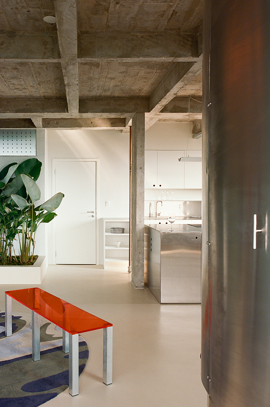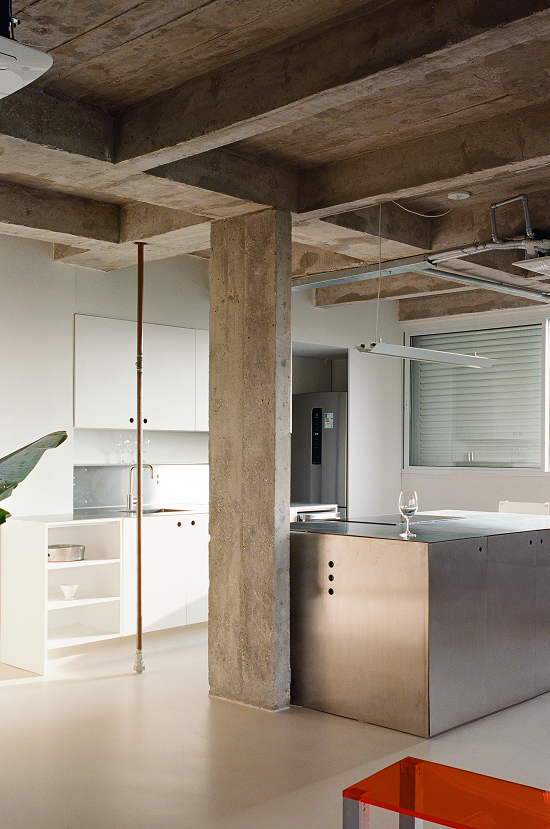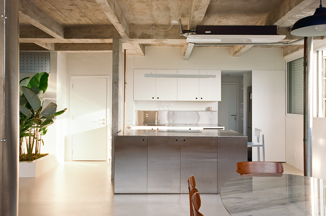 El módulo central alberga el estar y la cocina, conformando un espacio cuadrado de 9 × 9 metros. Uno de sus lados, orientado al norte, cuenta con un ventanal de piso a techo y un brise-soleil de hormigón en la fachada del edificio. Este ambiente contiene solo algunos elementos esenciales: una jardinera ubicada donde antes existía una viga invertida de uno de los baños demolidos; un cilindro de acero inoxidable que reemplaza la chimenea original; y una isla de cocina, también realizada en acero inoxidable.