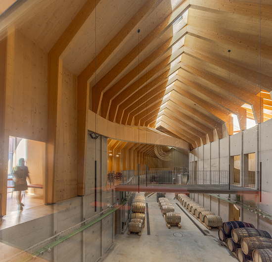 La geometría de la cubierta interpreta el tejado a dos aguas de la arquitectura vernácula, estructurado en madera. Esta estructura queda expuesta en el interior de la bodega y se transforma en un elemento escultórico sinuoso, continuo y orgánico, que fluye siguiendo las curvas tangenciales de los viñedos.