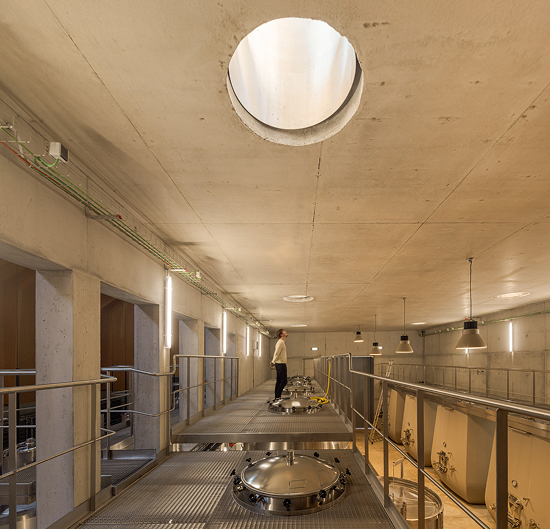 La configuración del conjunto se organiza a partir de una serie de naves interconectadas que siguen la topografía existente, una lógica que se replica en su funcionamiento interno, donde el proceso de vinificación se desarrolla por gravedad. Este sistema gravitacional, tradicional en las riberas del río Duero, se reinterpreta aquí incorporando capacidades operativas contemporáneas.