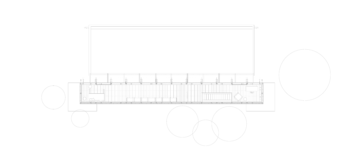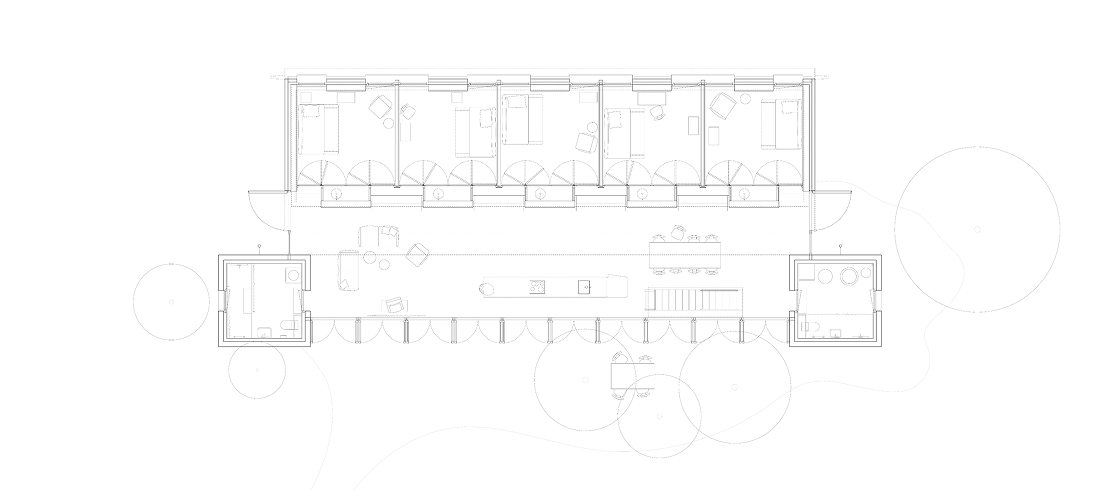 El esquema espacial combina privacidad y vida común. En planta baja se ubican las habitaciones privadas —todas iguales en tamaño y equipadas con kitchenette—, una amplia sala de estar compartida y servicios. Diez puertas dobles orientadas al sur convierten el corredor en una especie de calle interior. Con alrededor de noventa metros cuadrados, el área común ofrece una dimensión difícil de alcanzar individualmente y refuerza la idea de convivencia. Abierta por tres lados y atravesada por una lucerna que separa lo privado de lo colectivo, esta zona funciona como cocina, espacio de bienvenida, área de trabajo y sala de estar, retomando la lógica del tradicional porche orientado al sur.
