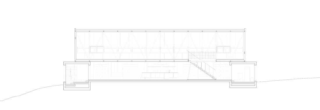 Sobre este espacio se dispone una sala multifuncional de veintiséis metros de largo, inspirada en los antiguos depósitos pastoriles. Construida como una celosía espacial y revestida con metal y madera, puede funcionar como almacén, área de actividades o alojamiento adicional, y se abre únicamente hacia el norte mediante paneles móviles.