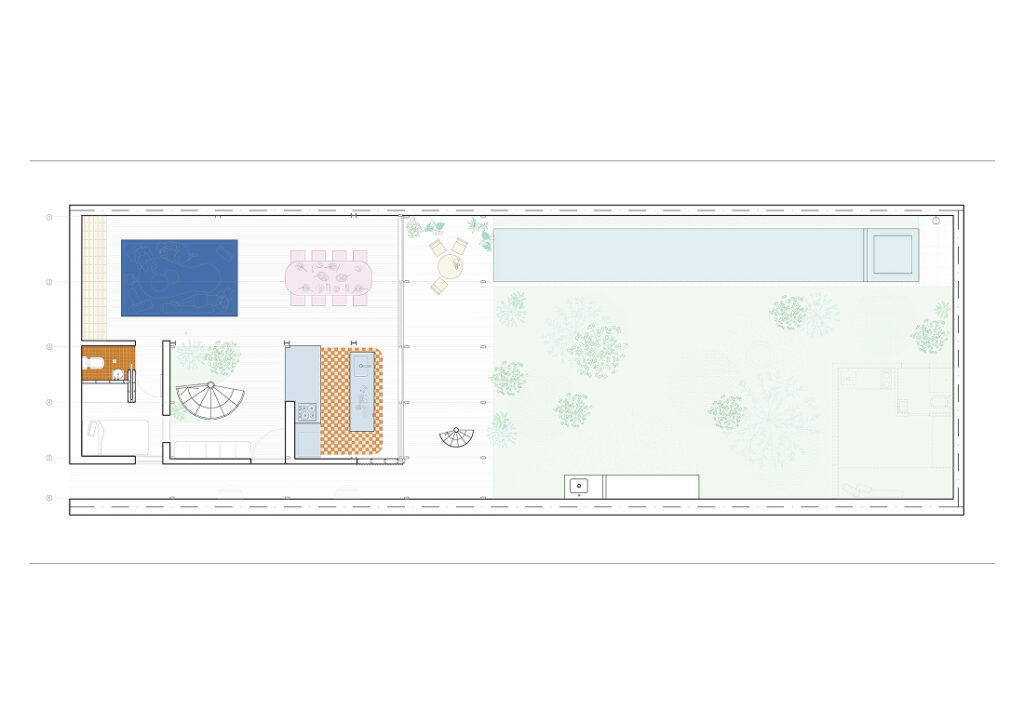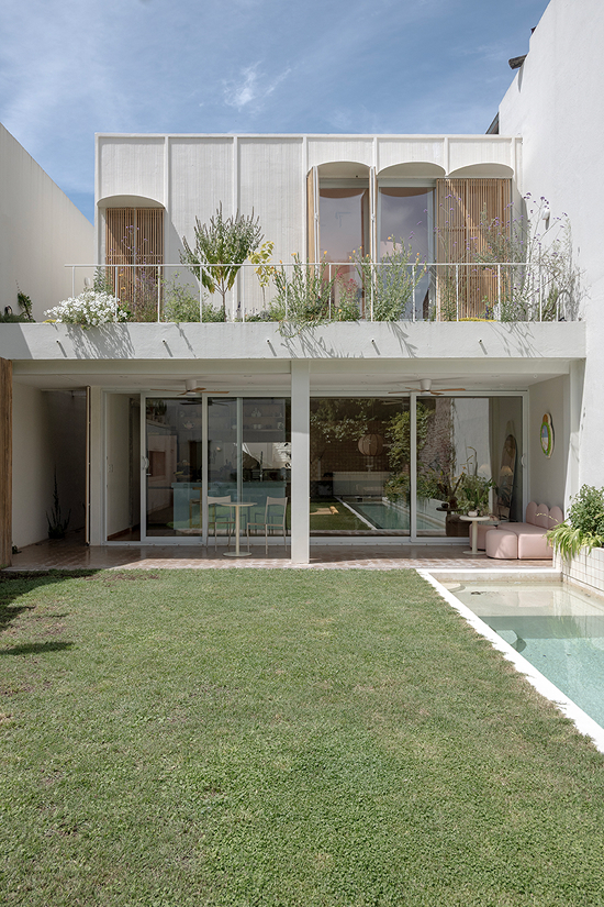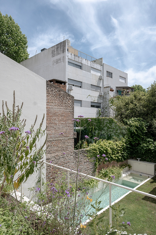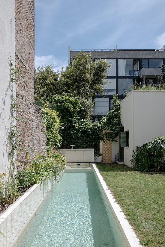 La cocina celeste se orientó hacia el patio y funcionó como vínculo entre el interior y el espacio semicubierto, permitiendo cocinar sin perder la conexión visual y social con el jardín. Al fondo del terreno, la pileta –dimensionada para nadar largos– se remató con un hidromasaje. También se recicló una volumetría existente para generar el guest house, al que se accedió por el pasillo típico del PH sin atravesar la casa principal. La vivienda pudo cerrarse por completo mediante postigones.