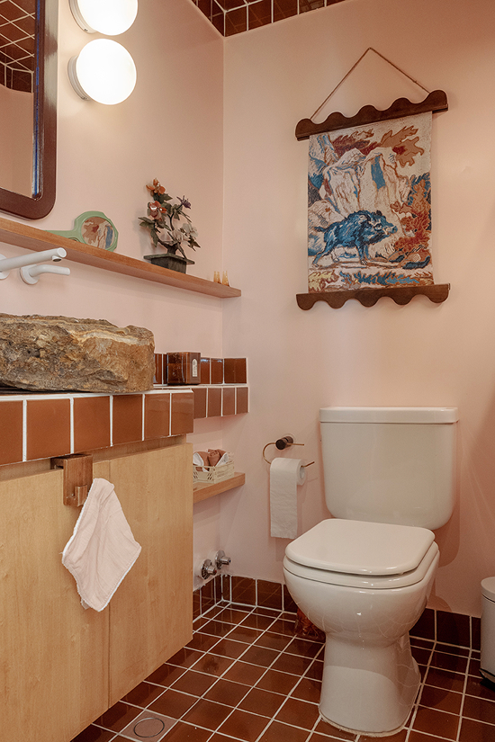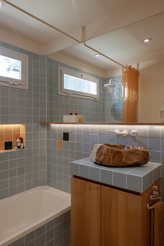 En la planta intermedia se ubicaron una habitación con acceso a la terraza verde, el lavadero y un baño completo en tonos celeste y ocre. Este baño se conectó mediante un conducto con el espacio de dormir del nivel superior, permitiendo depositar la ropa sucia sin necesidad de bajar.