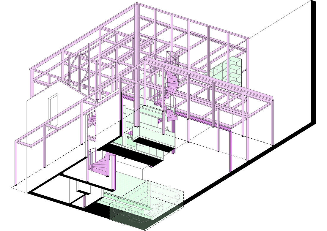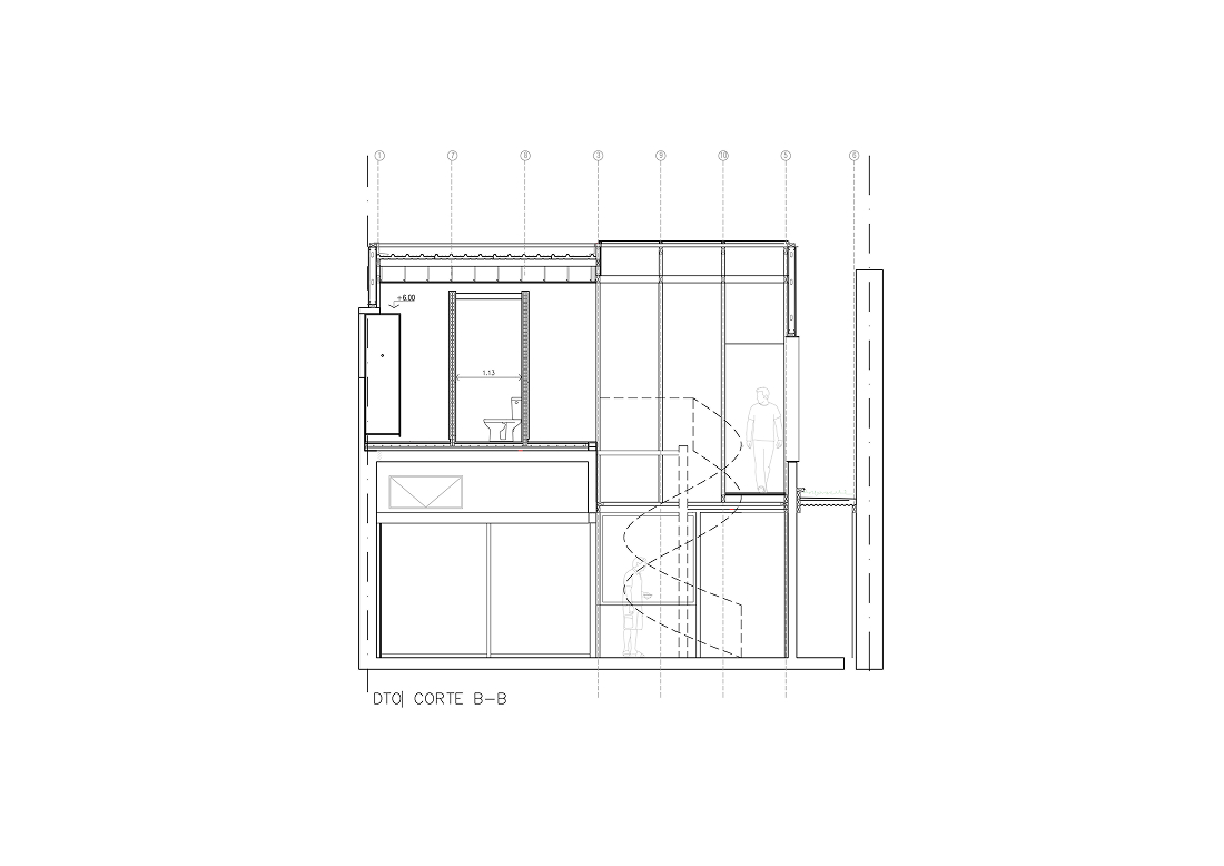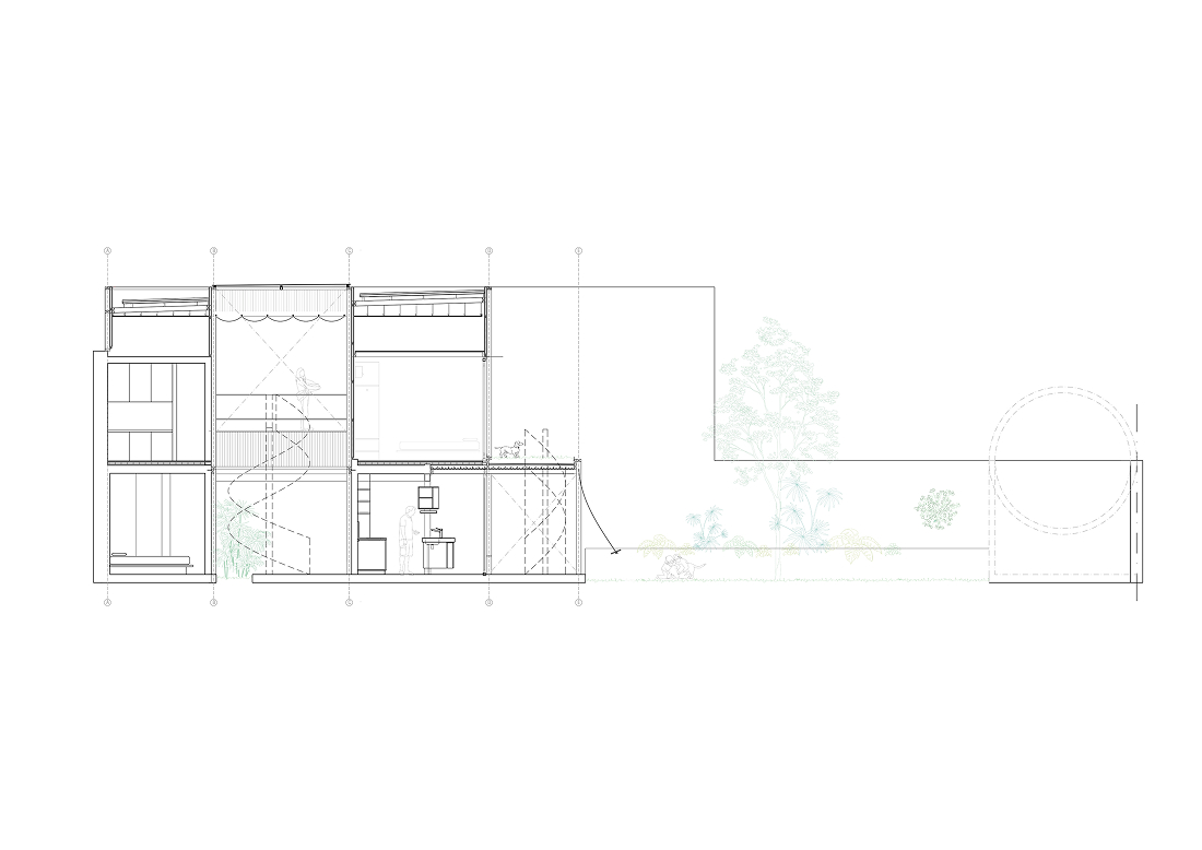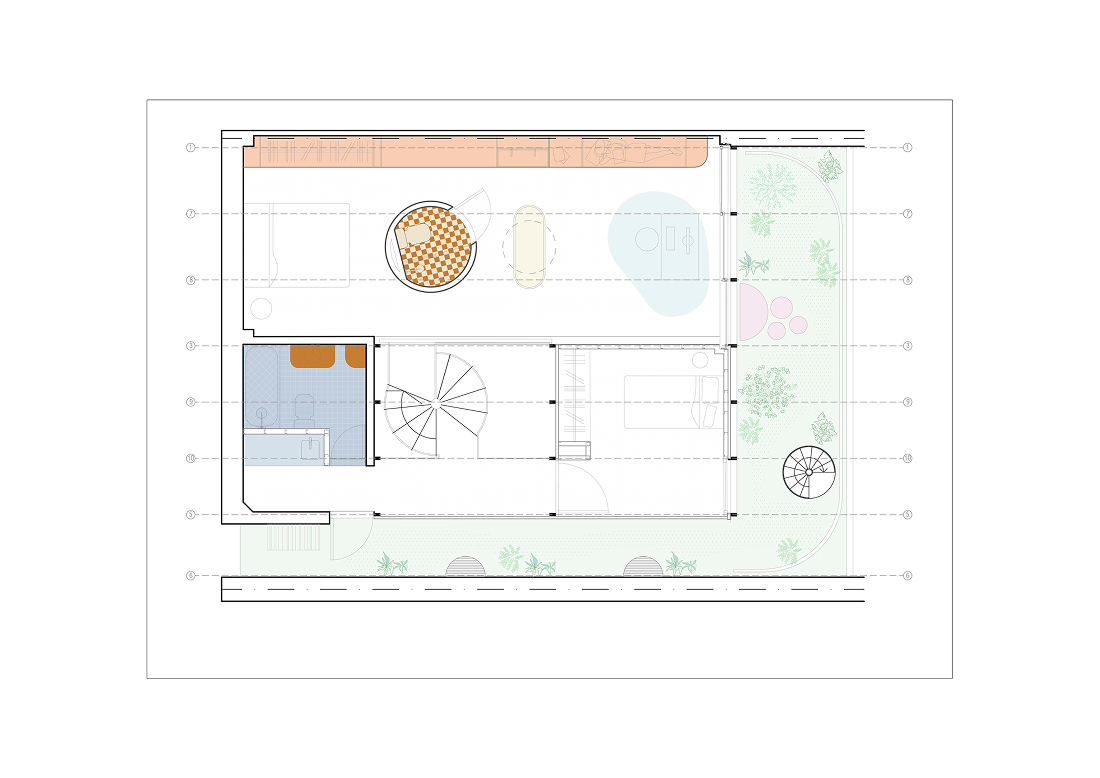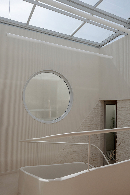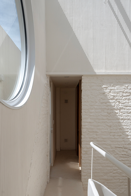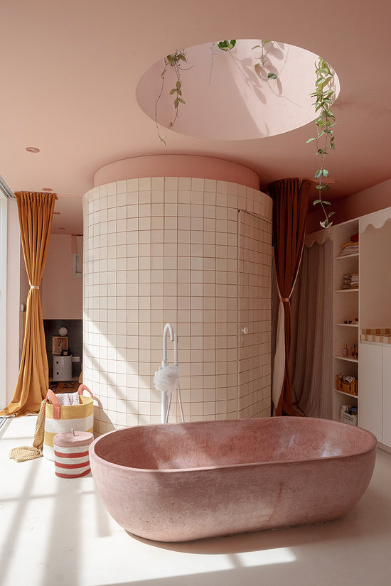 En la última planta se diseñó un espacio íntimo compuesto por el dormitorio principal, el baño y el escritorio. La propuesta evitó la habitación estándar y planteó un “espacio de dormir”: la cama como objeto, articulada con un volumen cilíndrico que concentró los elementos más privados del baño. La bañera se ubicó bajo un óculo rodeado de vegetación, permitiendo bañarse mirando el cielo.