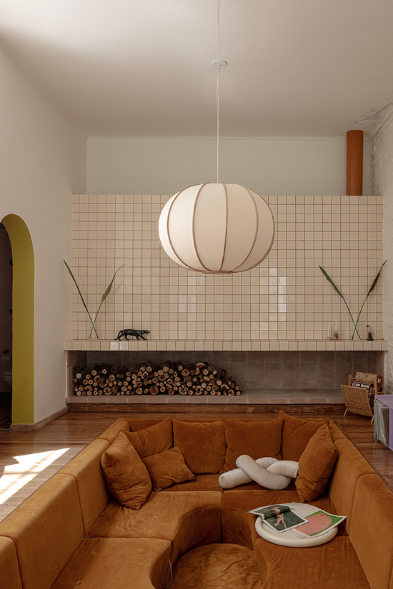 Una operación rectangular se transformó en un conversation pit de color suela, pensado como un espacio para contemplar el fuego, leer, mirar una película, reunirse y escuchar música.
