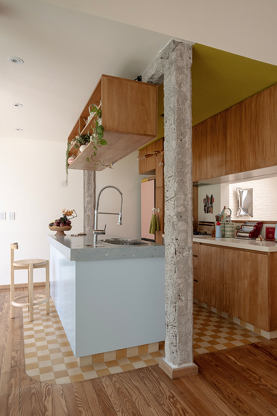 Desde el inicio, el equipo decidió mantener la preexistencia de la casa, conservando su vestigio. Se dejaron a la vista los muros de ladrillo originales y se restauró la pinotea. Sobre la construcción existente se diseñó una estructura tubular metálica que resolvió los nuevos metros cuadrados y dio lugar a un nuevo hogar.