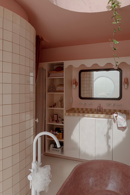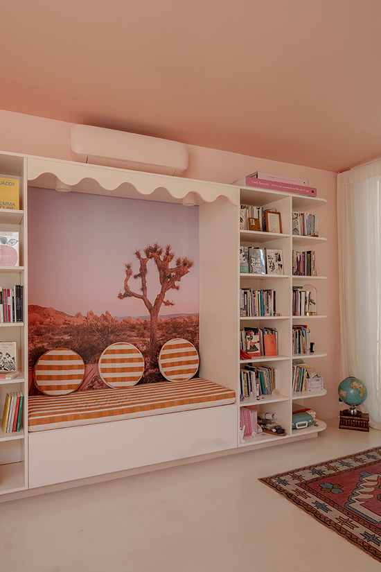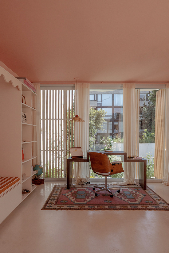 El escritorio se orientó hacia la terraza verde y el jardín. Todo el conjunto se articuló mediante un mueble rosado que integró guardarropas, área de bacha principal, biblioteca y asiento de lectura. Este nivel pudo abrirse o cerrarse completamente hacia el patio techado, recibiendo luz natural durante todo el día.