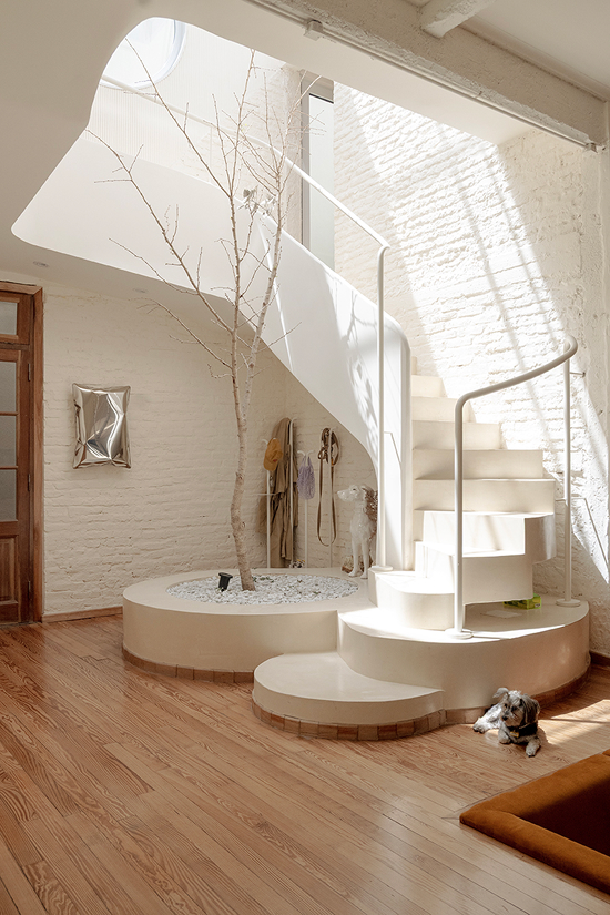 En planta baja se recuperó el patio típico de los PH y se lo transformó en un pulmón verde donde se desarrolló la circulación vertical. La escalera helicoidal, ubicada bajo una cubierta transparente, conectó los distintos niveles e inundó de luz natural el interior, manteniendo la relación visual con el cielo y aprovechando la orientación del terreno.