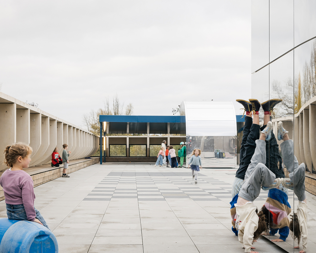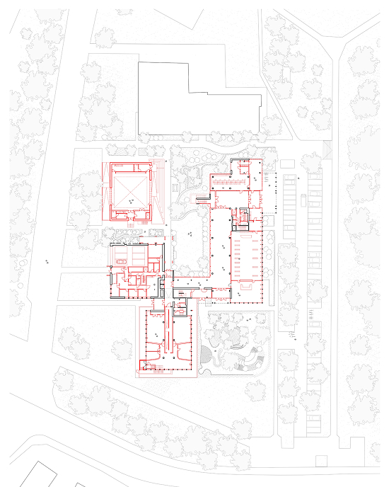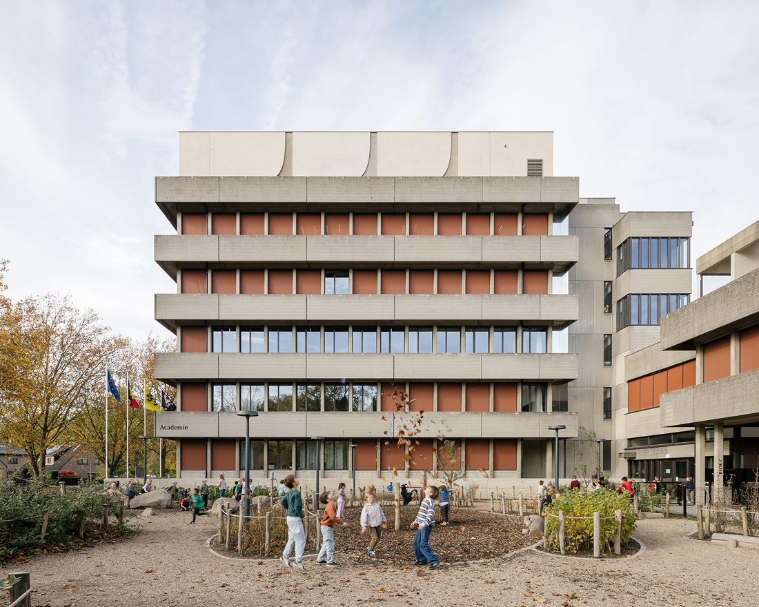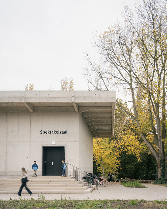 Así, el proyecto deposita una confianza radical en la espacialidad generosa y acogedora que ofrecen estos edificios, y la extiende hacia un nuevo conjunto. Se incorporan cuidadosamente variantes de columnas, paneles de fachada y vigas de hormigón. Lo antiguo y lo nuevo están claramente emparentados. Los nuevos elementos retoman el ritmo de las estructuras existentes, al tiempo que introducen bordes y líneas más suaves. Los edificios se elevan y se amplían, como si el diseño original continuará desarrollándose. Una nueva sala teatral, con una fachada de hormigón portante, se integra de manera fluida en el conjunto.
