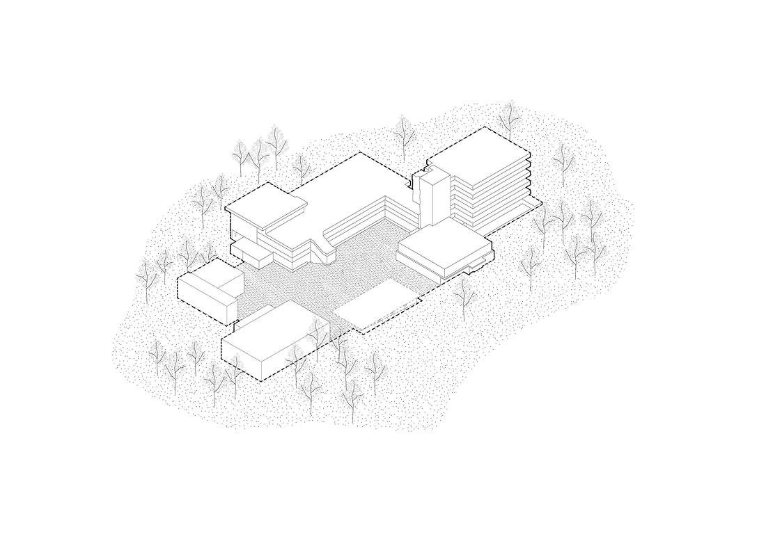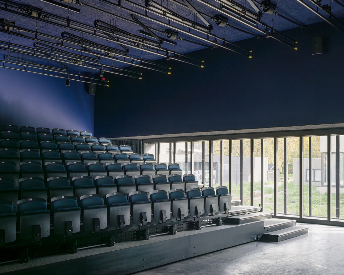 A su vez, se incorpora un cuarto edificio, la sala de espectáculos. Este conforma, junto con los edificios adyacentes, un conjunto multifacético en el espacio abierto. Los nuevos elementos de fachada de hormigón se disponen siguiendo un ritmo que se alinea con la cadencia del edificio existente. Los paneles esbeltos se curvan de acuerdo con una lógica tectónica que expresa la nueva fase constructiva.