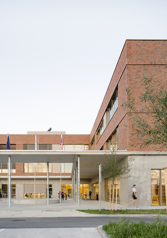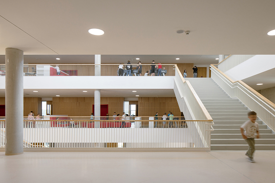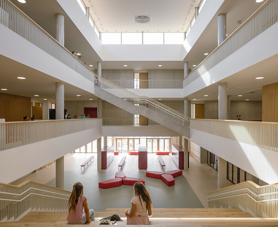 Los espacios comunes, tanto interiores como exteriores, desempeñan un papel crucial en la educación como las aulas tradicionales. En la tercera planta se sitúa un aula al aire libre. La escuela ofrece un universo interior y exterior rico en motivación, donde encuentran su lugar tanto el alumno de primaria como el estudiante adolescente.