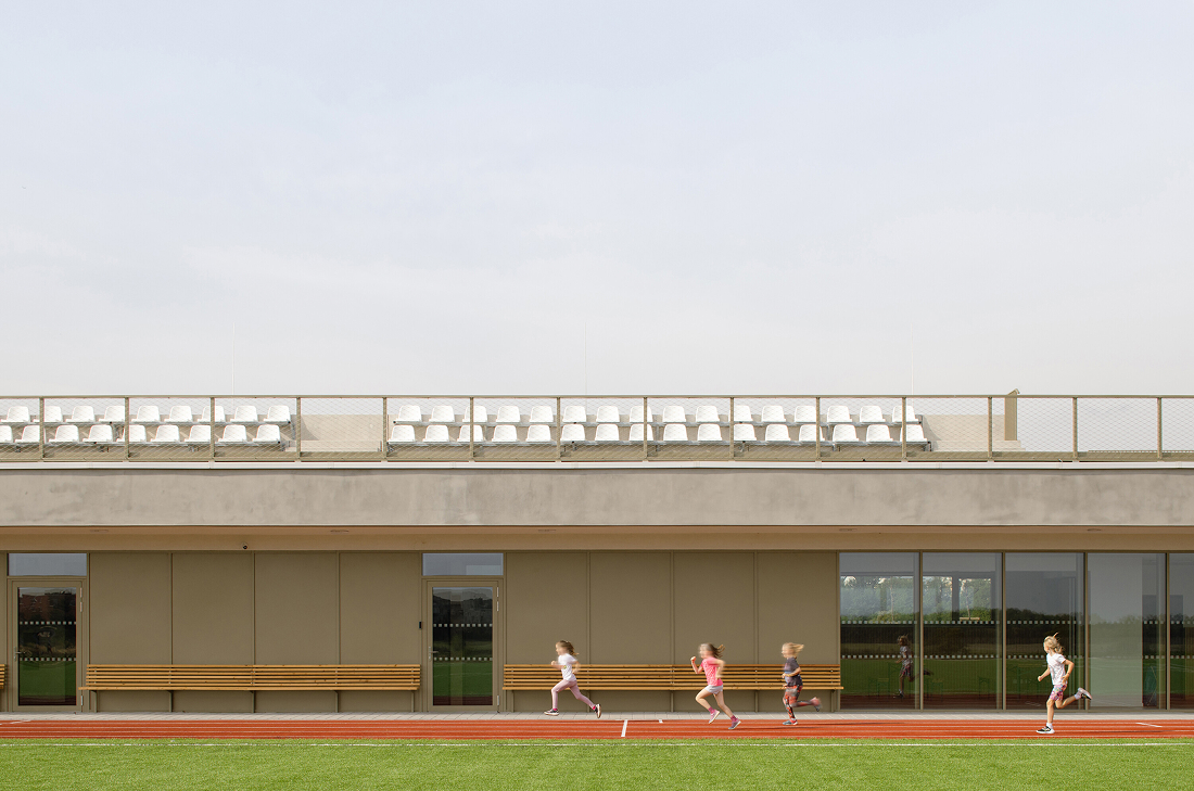 El complejo deportivo se desarrolla en el nivel uno del recinto. Este incluye varias pistas, un óvalo de atletismo con campo de fútbol integrado, servicios, un túnel de atletismo y zona de cafetería. Los espectadores pueden seguir la actividad desde el nivel de pista o desde una tribuna situada en la cubierta del edificio de servicios.