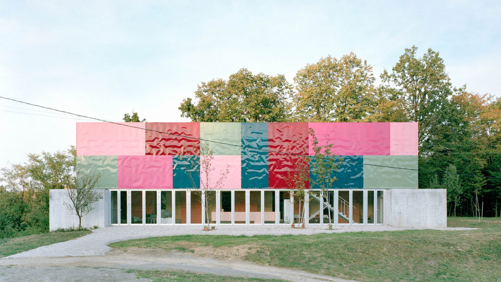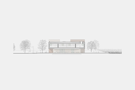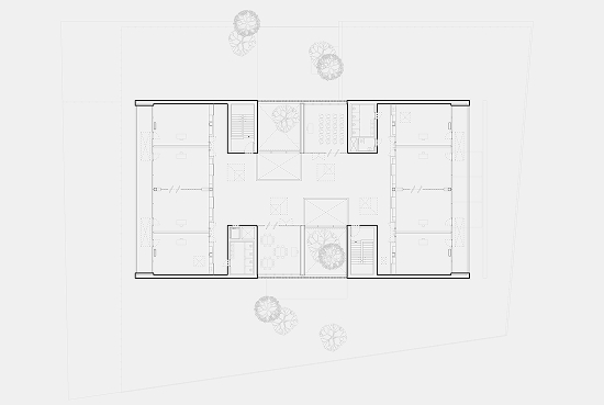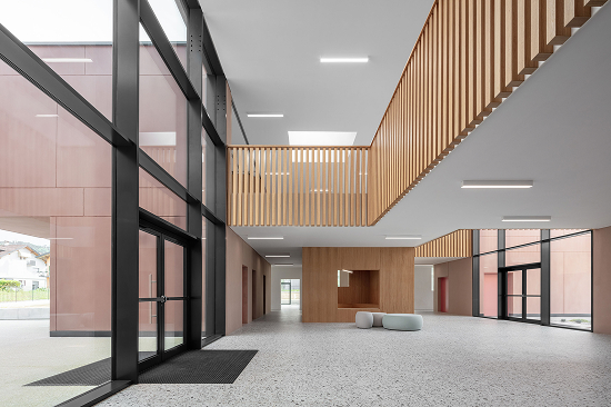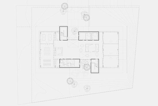 Los núcleos de hormigón coloreado, que concentran los espacios de servicio, definen el perímetro de esta ágora, donde las actividades se influyen mutuamente en un laboratorio extendido, animado por los volúmenes de madera de la sala de lectura y el front-office. El eje peatonal arbolado del masterplan atraviesa el edificio e introduce la vegetación en el interior mediante patios perimetrales que iluminan las áreas de uso colectivo.