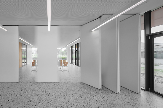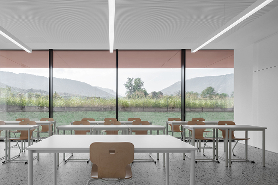En los dos niveles, aulas y laboratorios se disponen alrededor de la ágora, con la que mantienen un contacto constante gracias a ventanas y tabiques corredizos. La permeabilidad visual entre los distintos ámbitos configura un paisaje interior continuo. El proyecto busca, además, la coincidencia entre forma, estructura y materialidad a través de una envolvente de hormigón visto, realizada con tecnologías avanzadas de prefabricación que integran aislamiento y sistemas, evitando capas de acabado adicionales.