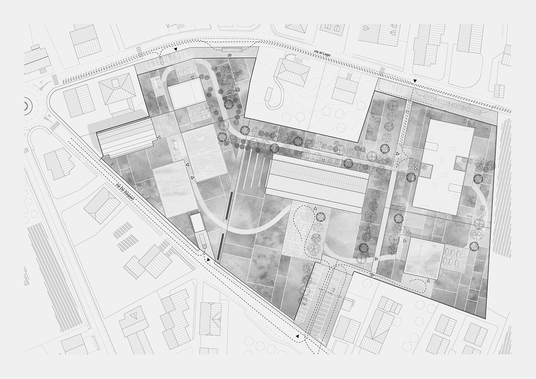 El proyecto surge a partir de un concurso organizado por AWN (Archiworld Network) y el Municipio de Alpago en 2018, orientado a enfrentar el fenómeno de despoblación mediante la inversión en infraestructura educativa. La nueva escuela se estructura en torno al concepto de “plaza cubierta”, retomando una idea primitiva de asentamiento: un volumen suspendido sobre cuatro núcleos que genera un espacio protegido en continuidad directa entre interior y exterior, pensado para funcionar como centro cívico fuera del horario escolar.