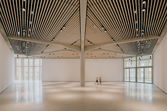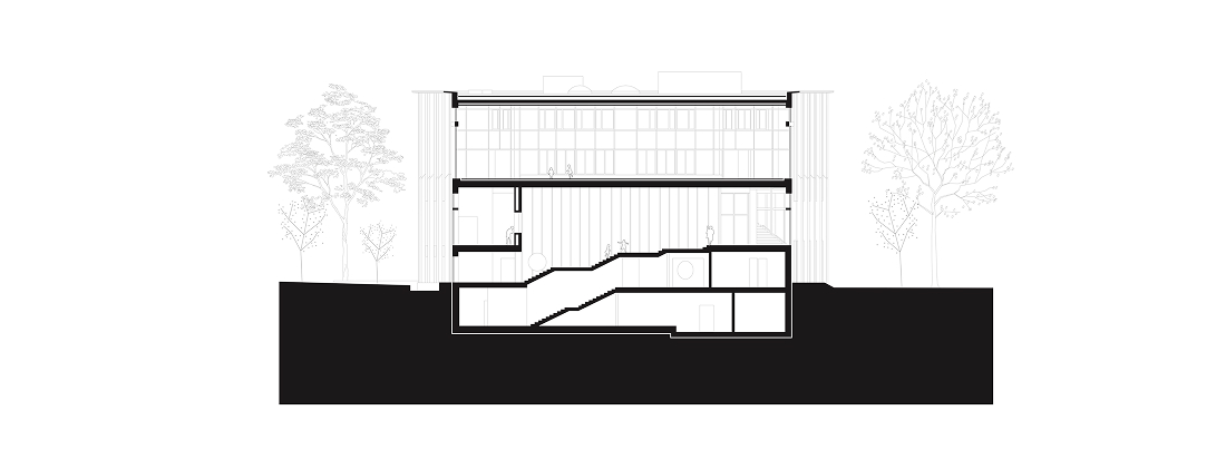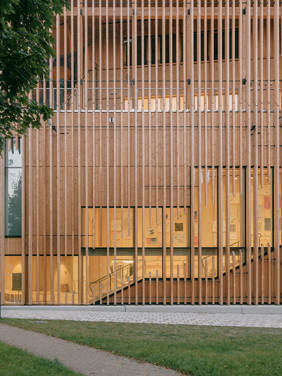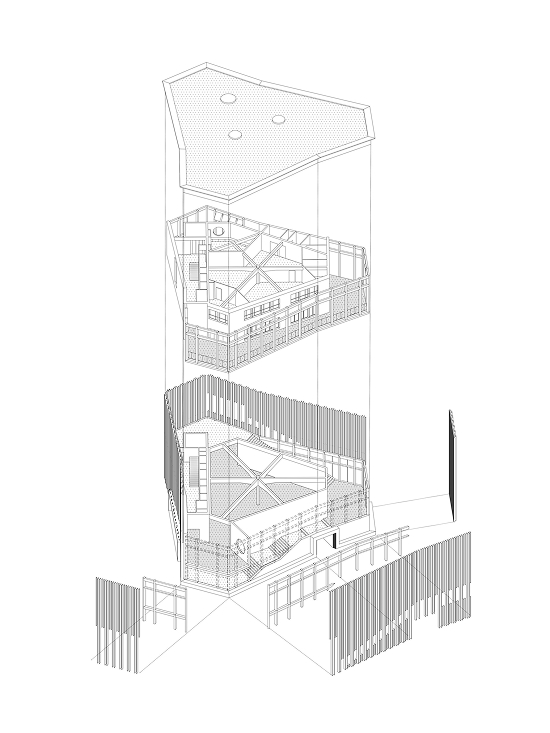 Este núcleo concentra los principales espacios programáticos y organiza la circulación vertical mediante una escalera helicoidal que asciende en espiral hasta el último nivel. Más que un elemento de paso, esta escalera se convierte en un espacio activo, con áreas para jugar, trabajar, producir y exhibir, conectando el acceso con las salas de exposición y los laboratorios interiores y exteriores. El laboratorio exterior, de dos niveles, aparece envuelto por una piel de listones de madera que recorre todo el edificio y genera la sensación de flotar entre las copas de los árboles del parque.