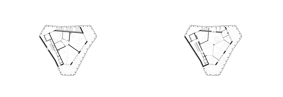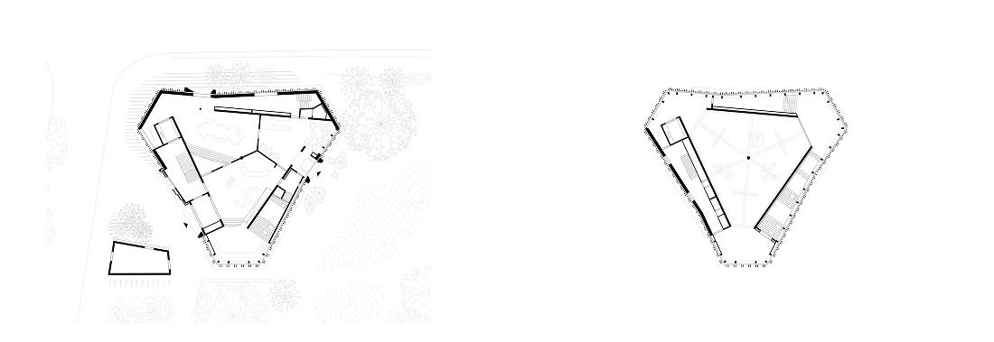 La huella del edificio adopta una geometría triangular, con lados levemente plegados hacia el interior y esquinas achaflanadas, lo que genera un motivo hexagonal recurrente en el interior. Aunque inicialmente se pensó como una estructura íntegramente de madera, el sistema fue reformulado por razones técnicas y económicas. En colaboración con ingenieros estructurales, se desarrolló una solución basada en un núcleo central de hormigón que funciona como un “tronco”, del cual parten seis “ramas” que distribuyen las cargas del edificio.