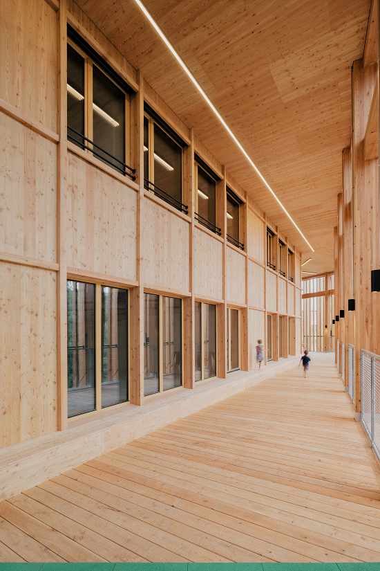 La fachada de madera actúa como un filtro que regula la luz natural y las vistas, produciendo un marcado juego de luces y sombras en el interior. Detrás de ella, una trama de carpinterías de madera estructura las superficies vidriadas. En conjunto con el hormigón visto y la estructura metálica, la madera aporta una atmósfera cálida y acogedora, tanto en los espacios interiores como en los exteriores.