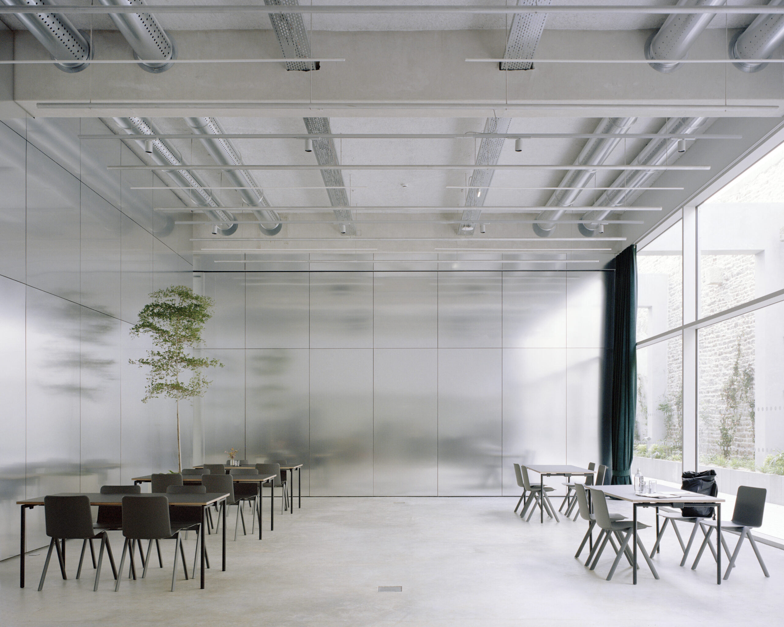 El proyecto puso el foco en la compacidad, la modularidad y la flexibilidad. Los niveles de trabajo bajo las cerchas, la sala Curieuse suspendida y la gran sala de eventos ilustran este enfoque. La sala de eventos cuenta con una grada retráctil de ciento cuarenta asientos y una partición móvil motorizada vinculada al sistema de seguridad contra incendios, lo que permite reconfigurar el espacio rápidamente. Estos dispositivos técnicos ocultos admiten la adaptabilidad programática.