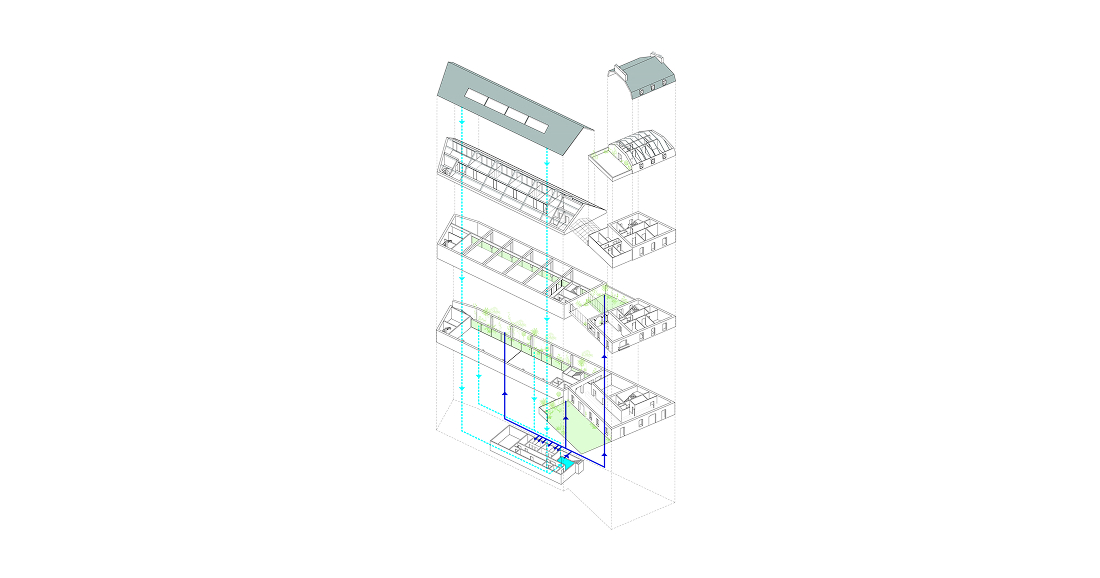 Un aspecto central en la intervención fue la transformación profunda de la nave, atendiendo simultáneamente a la degradación e inestabilidad de su estructura. Para ello, se retiró una porción completa de la cubierta a lo largo de toda su longitud. Esta operación permitió crear nuevos espacios, duplicar su capacidad de ocupación, reforzar la estructura e introducir luz natural en el corazón del edificio, sin necesidad de vanos hacia las propiedades vecinas, lo cual estaba prohibido. De este modo, se generó un patio ajardinado y un nuevo espacio flexible y adaptable, que se convirtió en núcleo del proyecto.