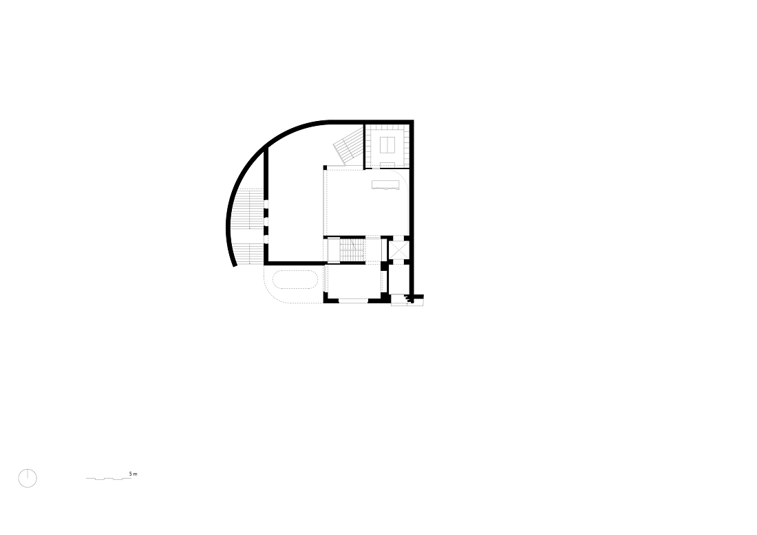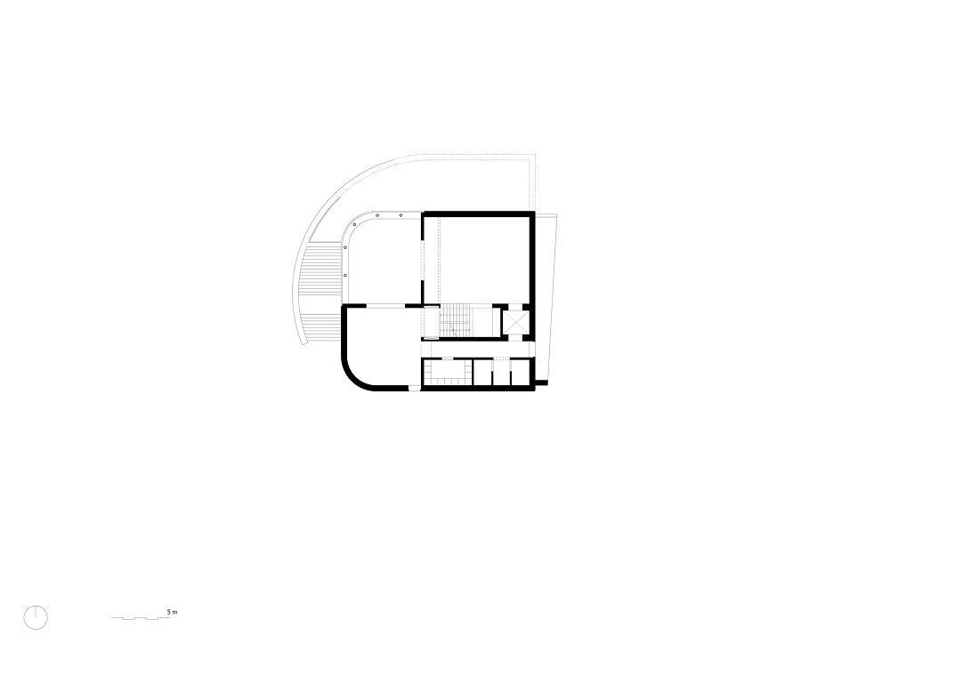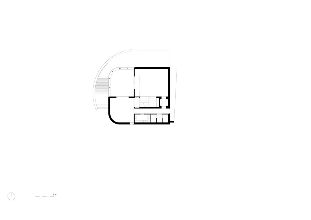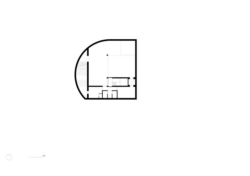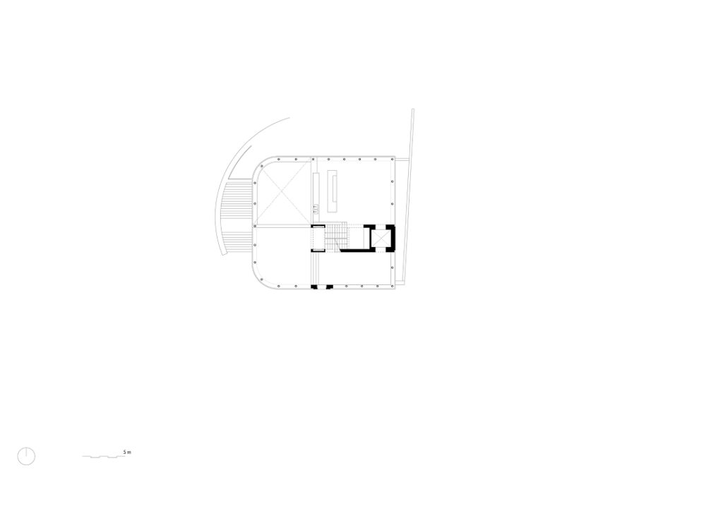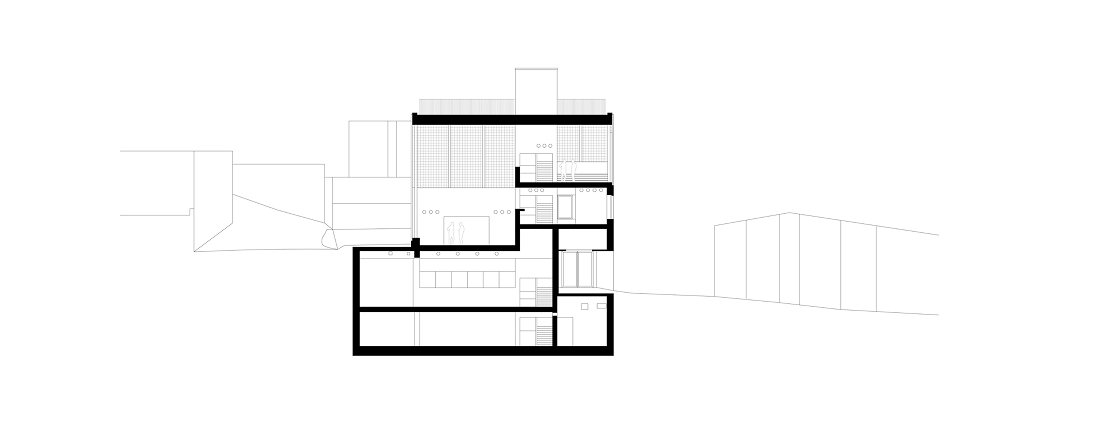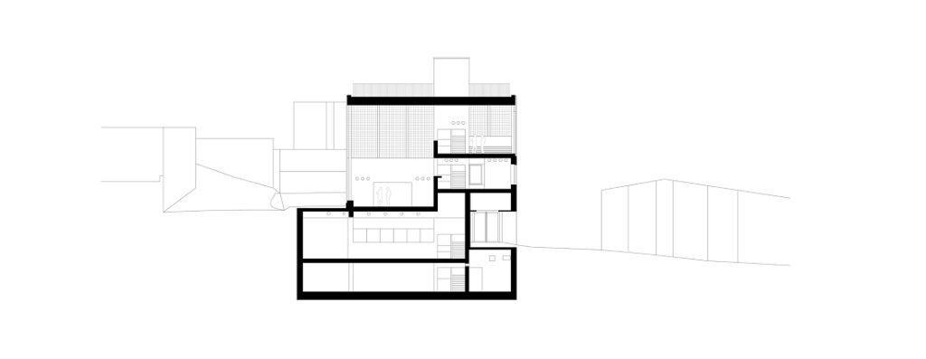 Para adaptarse al desnivel natural del terreno, el proyecto incorpora un sistema de medios niveles articulados por un núcleo vertical central. Este elemento actúa como columna vertebral del edificio, posibilitando una secuencia espacial continua y potenciando los espacios expositivos, donde las distintas alturas generan proporciones y atmósferas diversas.
