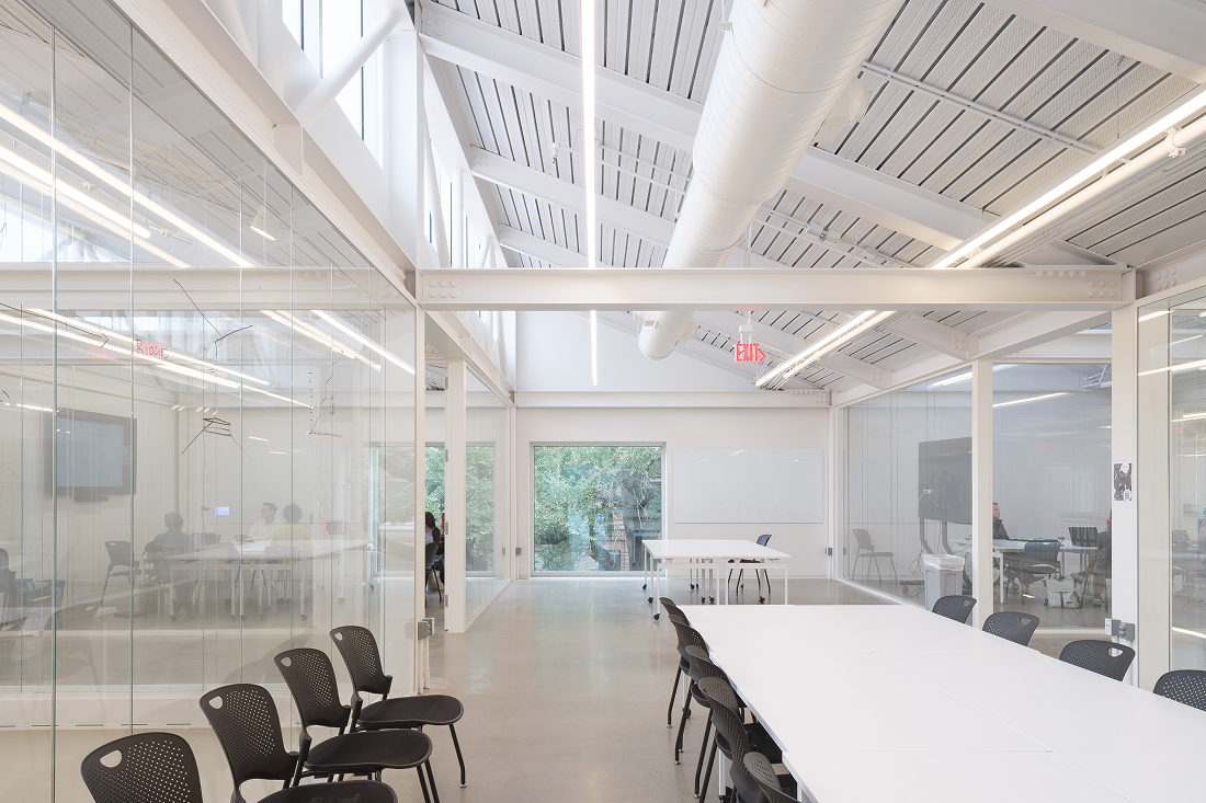 Así, incorpora dos mil cuarenta y cuatro metros cuadrados destinados a producción, intercambio y exposición para la Escuela de Arquitectura de Rice. En diálogo con el edificio existente, el nuevo pabellón aporta escalas espaciales antes inexistentes y lo equipa para pedagogías en evolución.