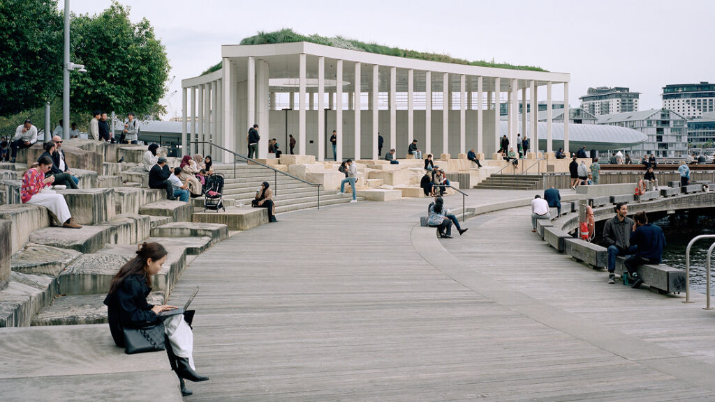 En el suelo, un zócalo de hormigón define la negociación con la topografía. La pieza alberga camarines y servicios, absorbiendo el desnivel del sitio, articulando un borde hacia el humedal presente, y actuando como solución frente a la lluvia y la relación con el nivel de agua del lago.