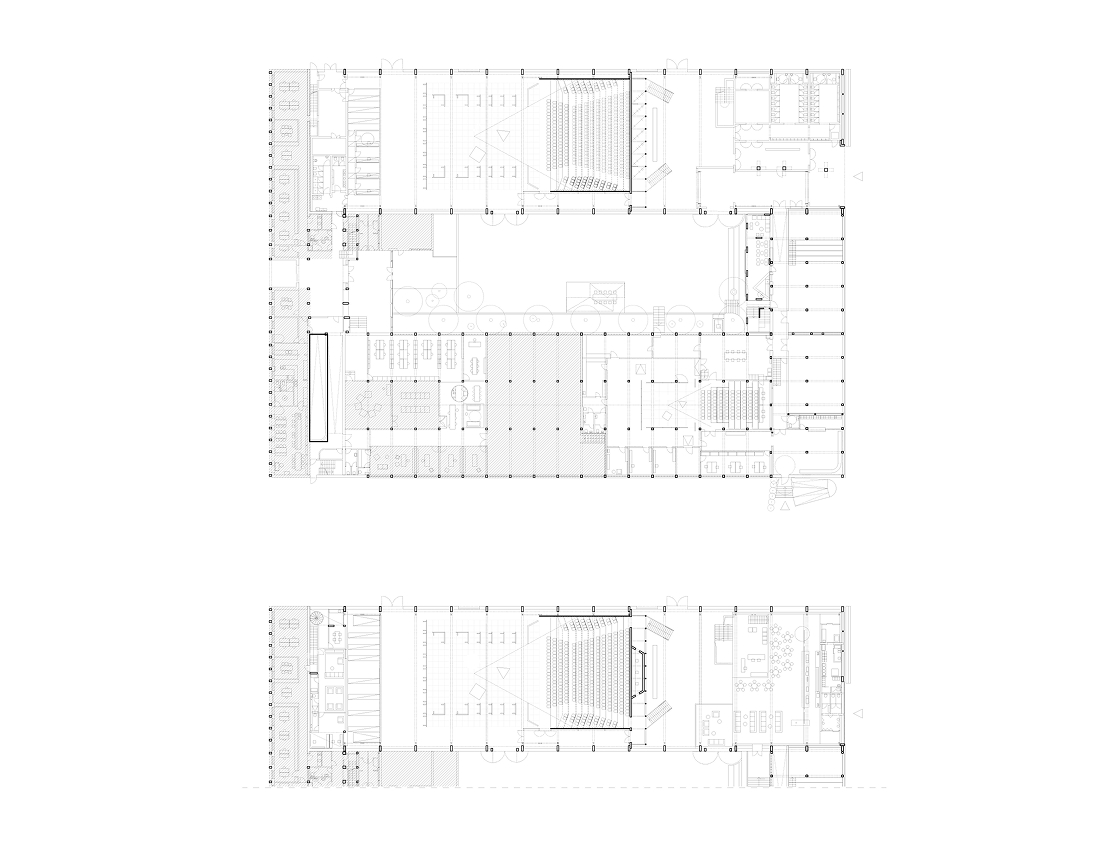 El conjunto incluye la sala principal o Big Stage con 361 butacas y su lobby adyacente, un bar público con boletería y terraza abierta hacia el patio interior, la sala Small Drama con 100 butacas y foyer propio, áreas técnicas y de servicio, dos salas de ensayo y un pabellón con bar para empleados que también se vincula con el patio.