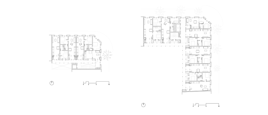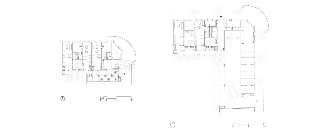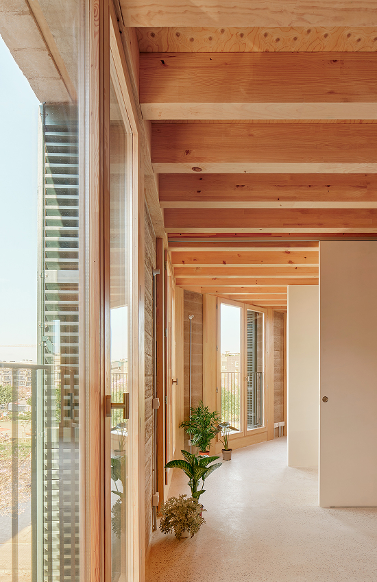 El acceso a las viviendas se produce a través de un vestíbulo que conduce a un patio interior desde el cual las unidades se distribuyen mediante pasarelas porchadas. Este esquema refuerza los vínculos vecinales y establece un gradiente claro entre lo comunitario y lo doméstico. Las viviendas, de uno o dos dormitorios, tienen doble orientación y prescinden de pasillos, organizándose en torno a una cocina central vinculada visualmente con la sala de estar. En el suroeste, una galería multifuncional aporta privacidad y confort térmico, actuando como captador solar en invierno y favoreciendo la ventilación cruzada en verano.