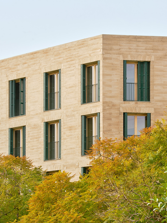 El proyecto se ubica al norte de Palma, en un tejido heterogéneo desarrollado por etapas, donde conviven áreas agrícolas con viviendas de baja densidad. La solución estructural retoma una lógica tradicional en la que la propia estructura del edificio define los espacios habitables, integrando funciones portantes y de uso. La propuesta busca una correcta inserción en el entorno urbano y una respuesta funcional acorde al programa. El edificio principal se implanta en una parcela en esquina con forma de “L” y una profundidad edificable de 11,5 metros. Se organiza en planta baja y cuatro niveles destinados a viviendas, mientras que el sótano y parte de la planta baja alojan un estacionamiento con 30 plazas. Un segundo volumen, situado en una parcela rectangular, cuenta con planta baja y un primer piso que albergan ocho unidades adicionales.